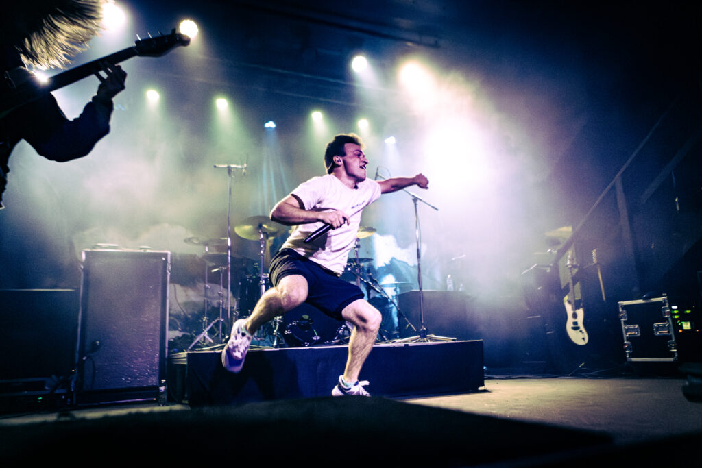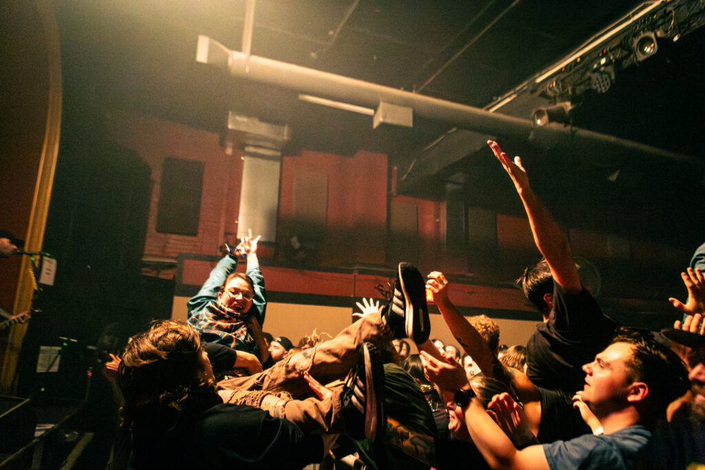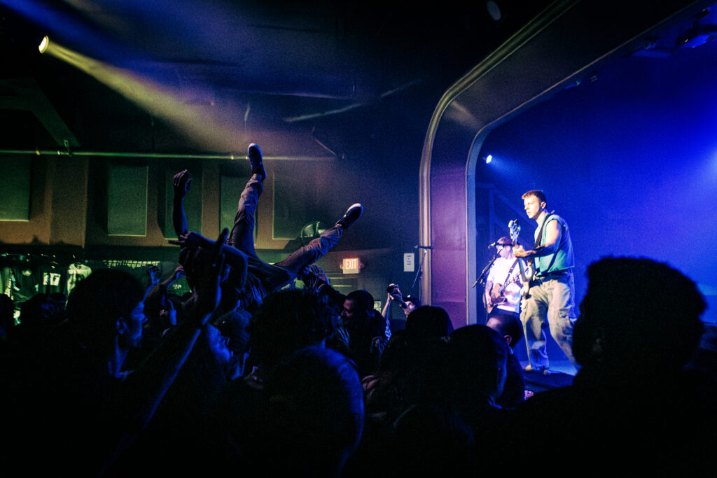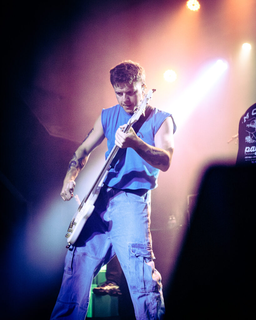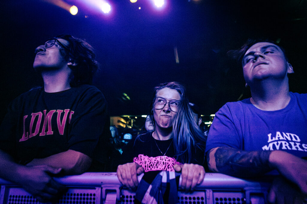 LANDMVRKS entered the stage after Silly Goose with the high energy anthem “Creature”, the second track from their latest album, The Darkest Place I’ve Ever Been. They followed that with “Death” from 2021’s Lost In The Waves. Prior to their third song, “Blistering” from their 2018 album Fantasy, vocalist Salfati called for crowd surfers and was not disappointed. The flow of bodies throughout ”Blistering” was endless, so much so that two extra security ran to the front to lend a helping hand. There wasn’t much of a break in the surfing the rest of the night, either, other than maybe during the just-over-a-minute rap-heavy beat “Sombre 16” and the stripped down intro to “Suffocate”, which Salfati played solo on stage before being joined by the rest of the band after the first chorus.