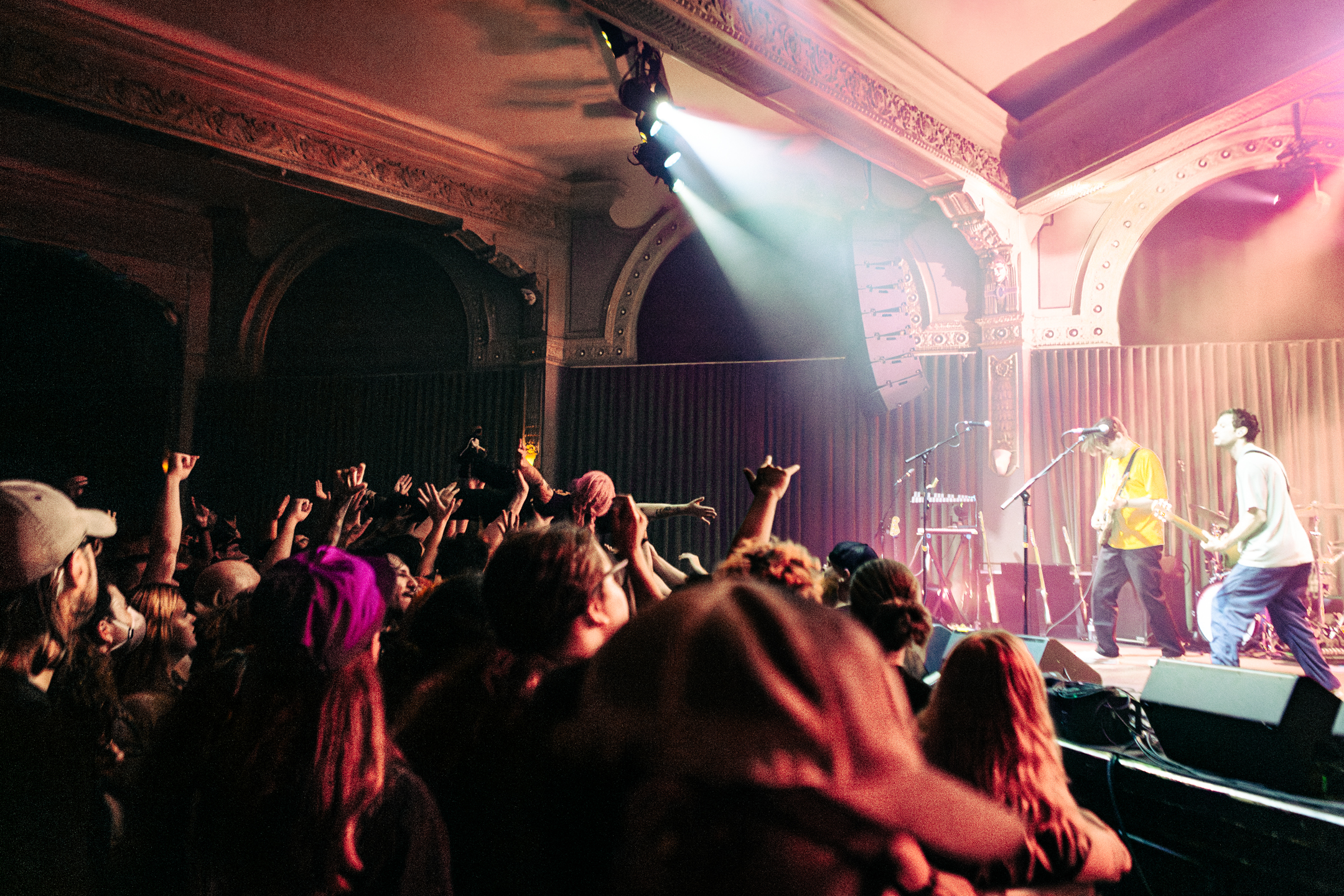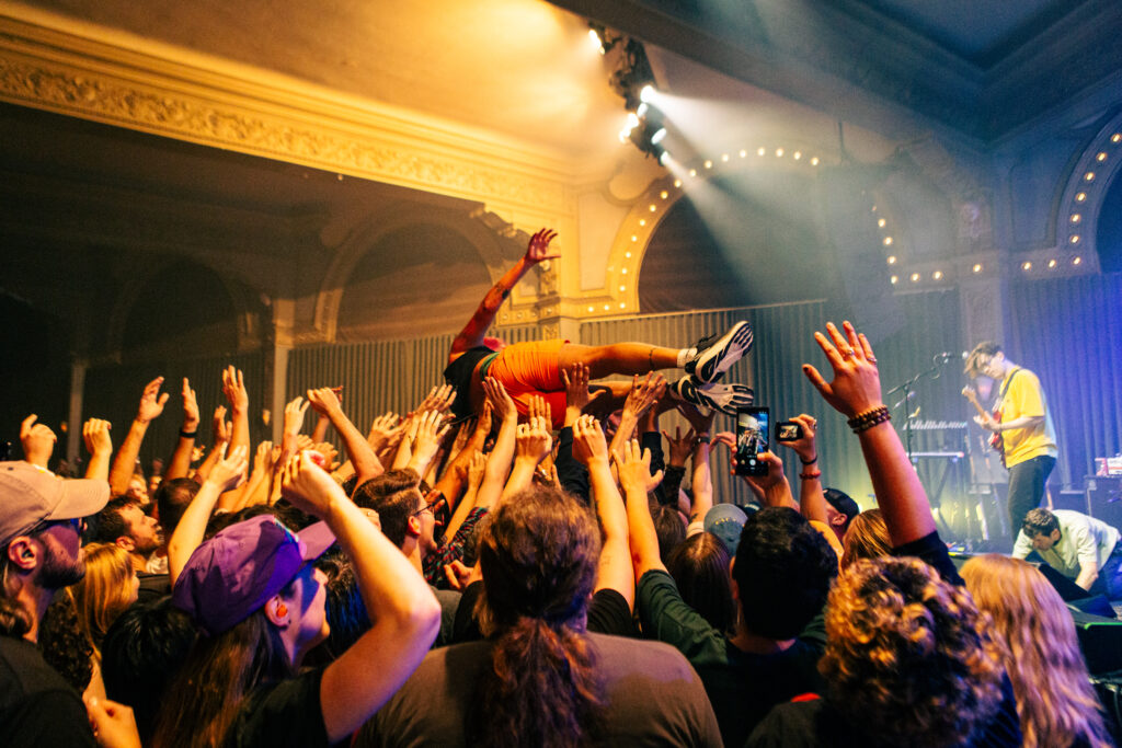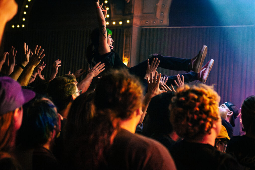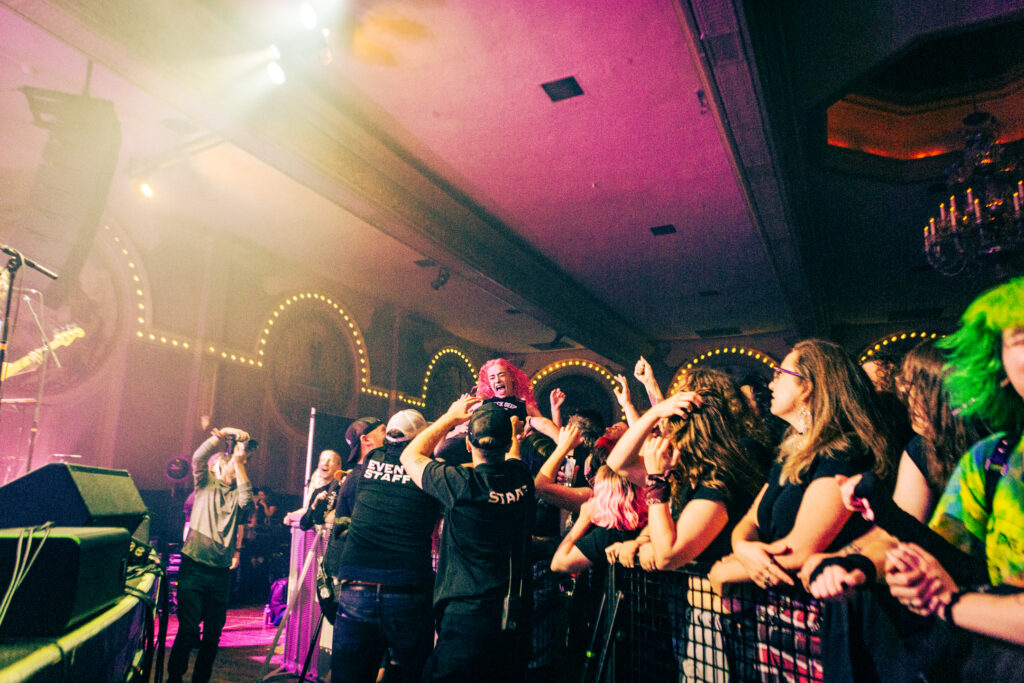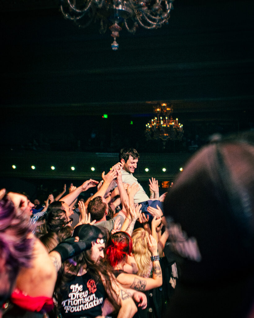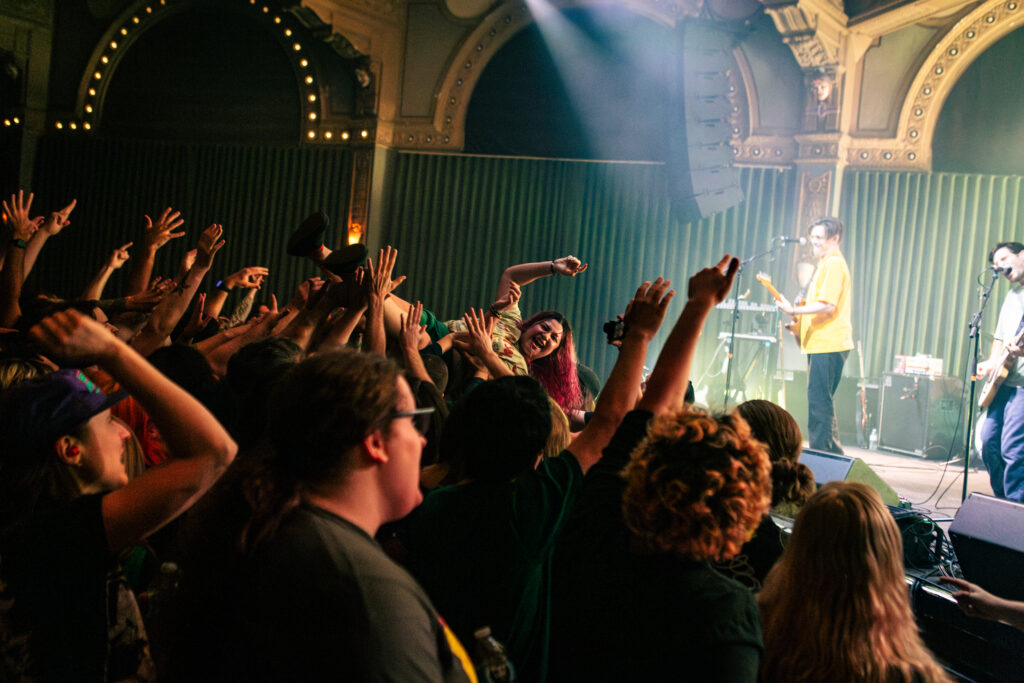 Babcock and Rosenstock certainly weren’t the only crowdsurfers of the evening. The crowdsurfing started early in Rosenstock’s set, and from then on there was a consistent flow of surfers throughout the evening, with both the all-ages side of the venue and the 21+ bar side seeing heavy crowdsurfing— something not too common with the way Crystal Ballroom splits the venue diagonally for all ages shows. Babcock and Rosenstock took full advantage of the diagonal divider, however, utilizing the pathway through the crowd to run out and greet the enthusiastic audience during the show. Throughout both Rosenstock and PUP’s set the crowd was wildly energetic. The famed spring-loaded floor of the Crystal Ballroom bounced with each jump. Thanks to the construction of the floating dance floor, the sold out room was, quite literally, rocking.