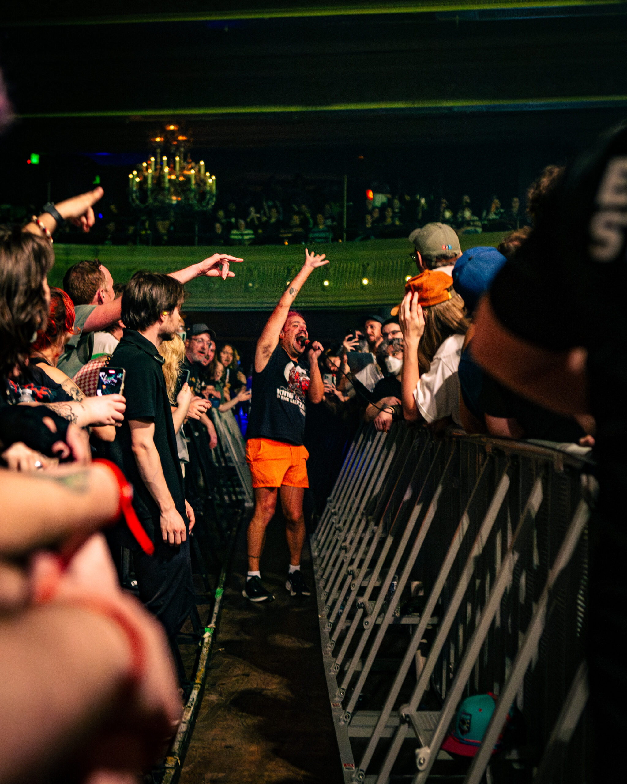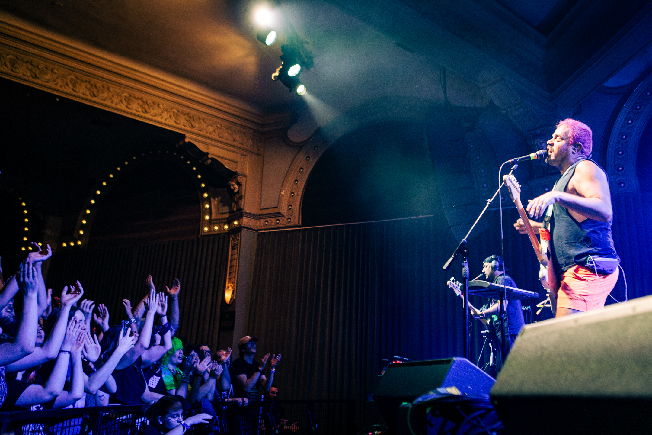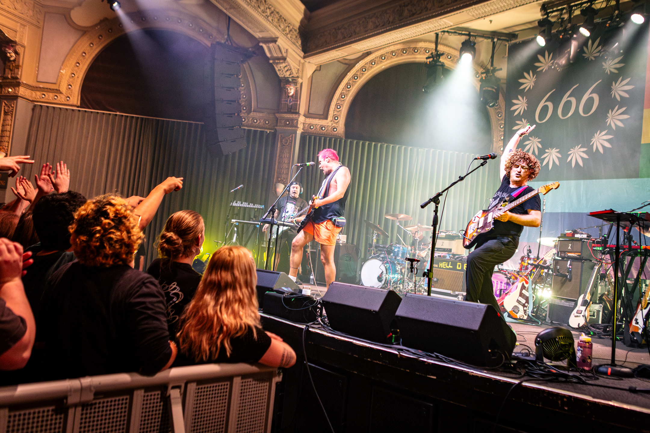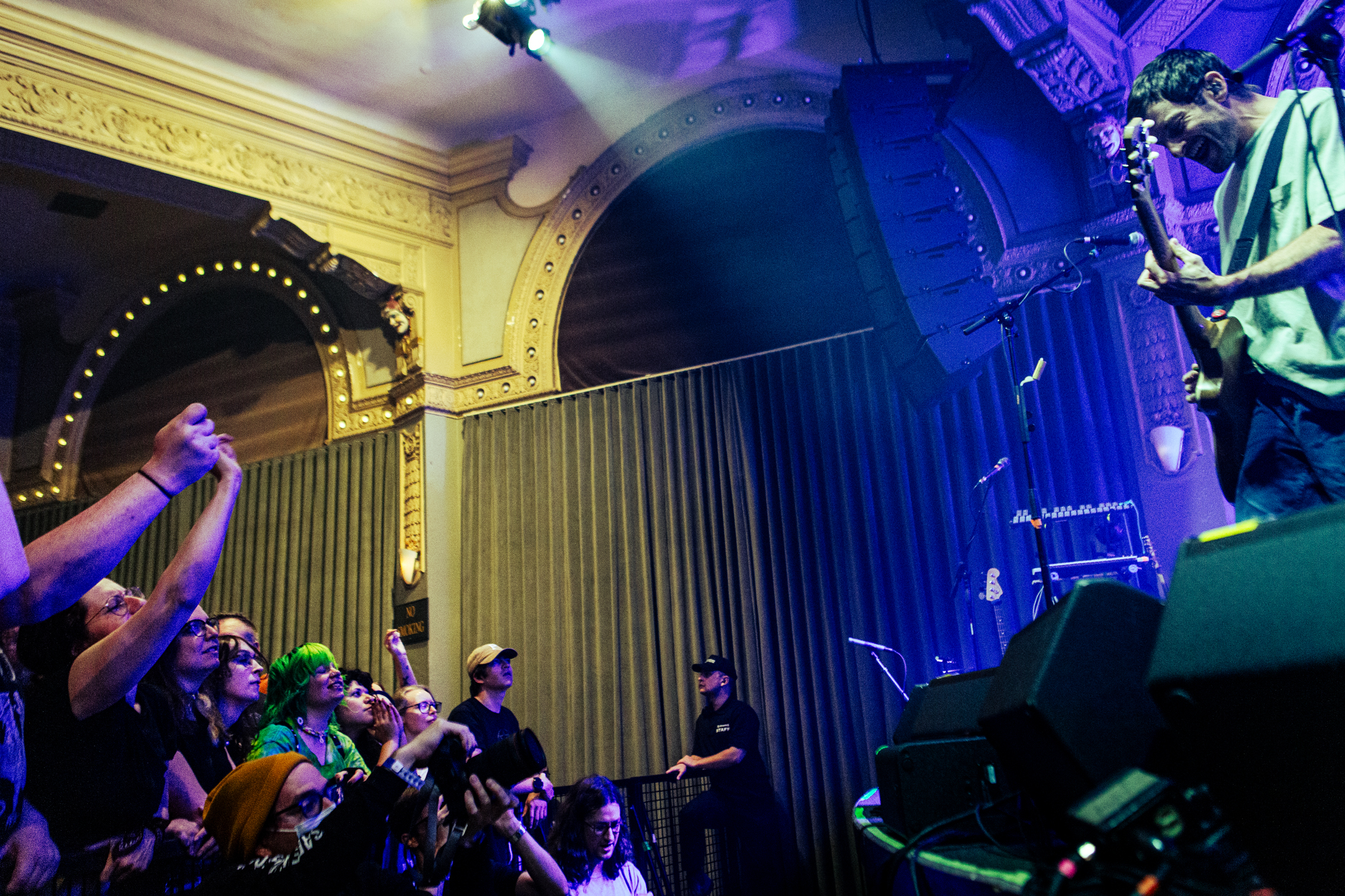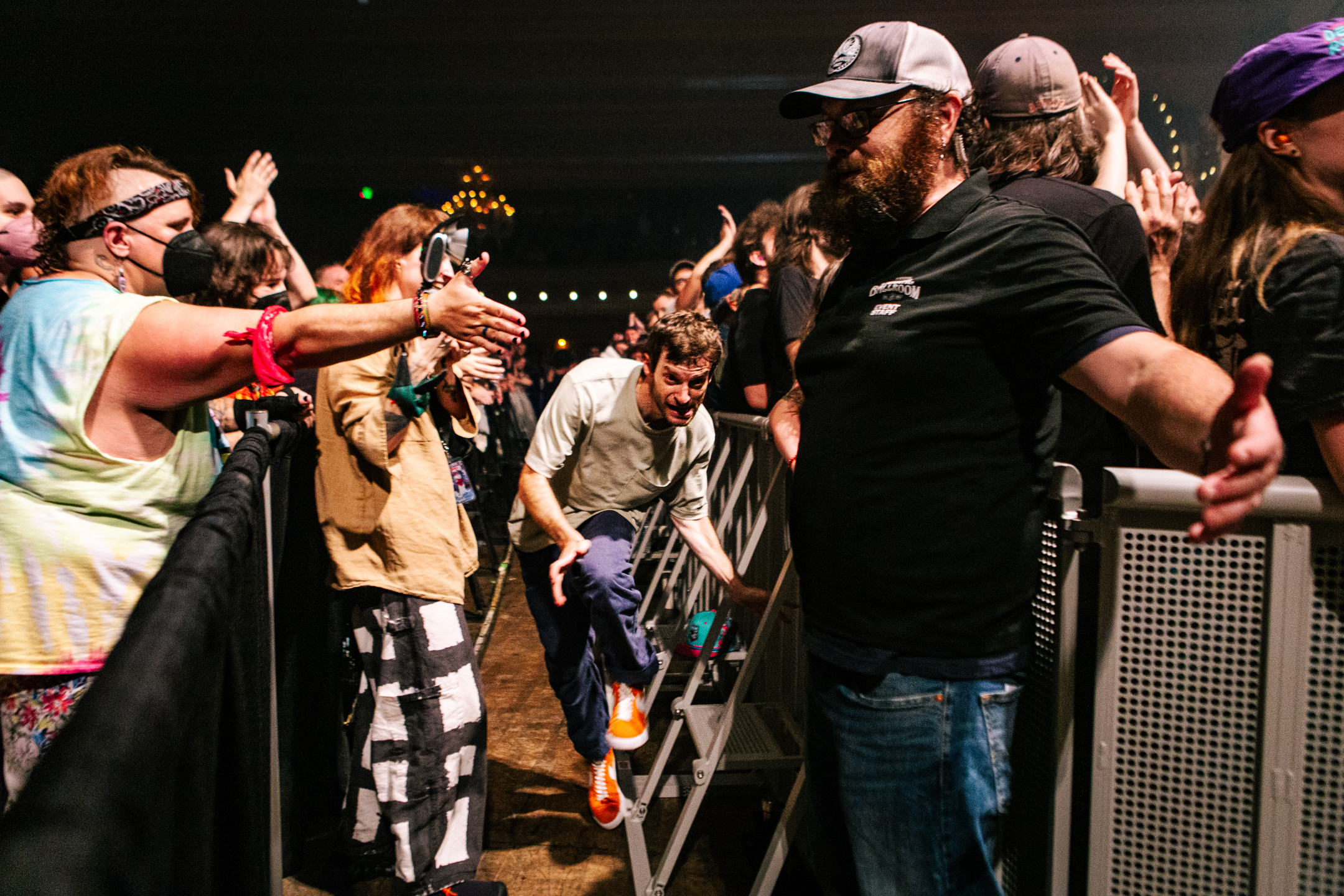 Babcock and Rosenstock certainly weren’t the only crowdsurfers of the evening. The crowdsurfing started early in Rosenstock’s set, and from then on there was a consistent flow of surfers throughout the evening, with both the all-ages side of the venue and the 21+ bar side seeing heavy crowdsurfing— something not too common with the way Crystal Ballroom splits the venue diagonally for all ages shows. Babcock and Rosenstock took full advantage of the diagonal divider, however, utilizing the pathway through the crowd to run out and greet the enthusiastic audience during the show. Throughout both Rosenstock and PUP’s set the crowd was wildly energetic. The famed spring-loaded floor of the Crystal Ballroom bounced with each jump. Thanks to the construction of the floating dance floor, the sold out room was, quite literally, rocking.