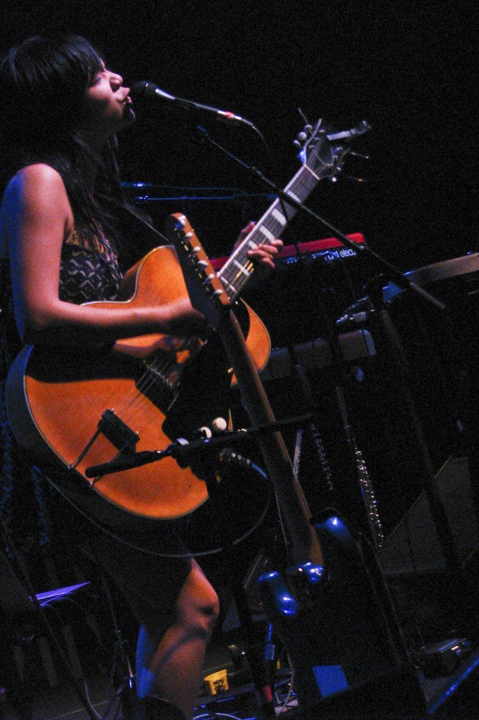 Once you learn how to pronounce Thao Nuyen’s name you are unlikely to forget her or the the upbeat alternative folk that she and The Get Down Stay Down are all about. The diminutive Thao, frantically strumming and pounding out rythmic guitar beats, quickly filled the Crystal Ballroom with energy that did not abate. The floating floor was bouncing within seconds of their first song. Their effortless blend of alternative, folk-infused indie rock was dance, clap, and stomp-worthy, to which the crowd obliged exuberantly.
